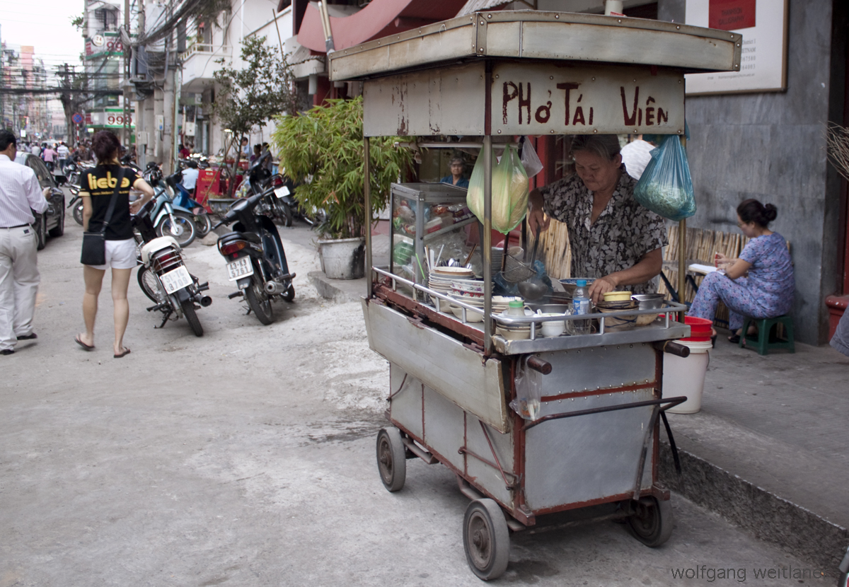 Viele der fahrbaren Stände verkaufen Phó – eine klare Rinderknochen-Suppe mit Reisnudeln und allerlei Kräuter-Einlagen. Die Phó ist aber mehr als nur eine Suppe – sie ist ein vollständiges Gericht. Und so wird sie auch behandelt. War sie früher in erster Linie ein Frühstück, so wird sie in den großen Städten den ganzen Tag über angeboten. Übrigens ist das Nachwürzen nicht nur gestattet, sondern erwünscht, denn aus der an und für sich milden Grundversion braut sich so mancher Vietnamese einen höllisch scharfen Sud mit reichlich Limettensaft, Fischsauce und Chillies.