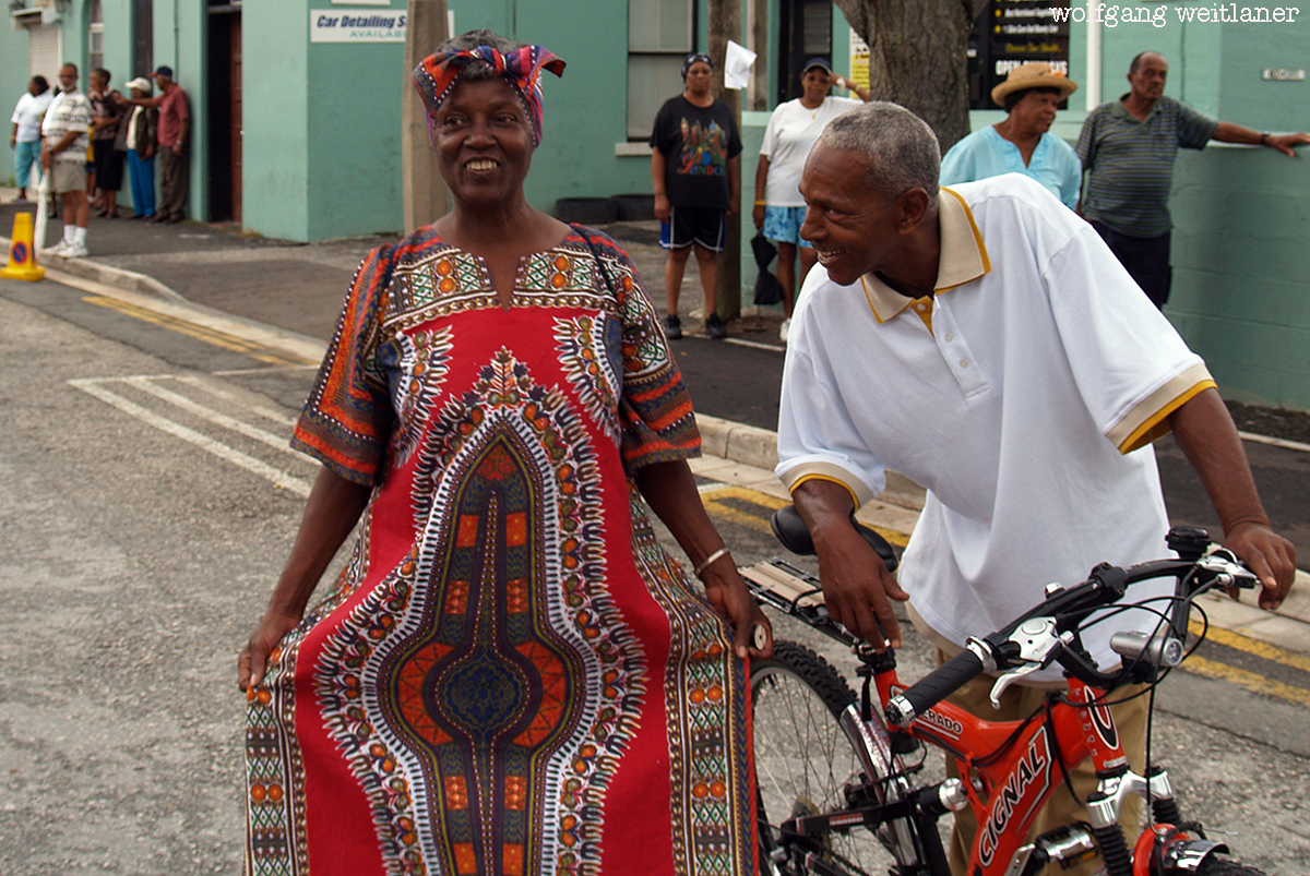 Anfang September feiert man in Bermuda Labour Day – und die Parade, die da über die Bühne geht, trägt schon sehr viel Lokalkolorit. Bermuda – seit fast 500 Jahren britische Kolonie (hier lebte zuvor niemand) – ist per se eigentlich keine Karibikinsel, sondern liegt rund 800 km vor der Ostküste des US-Bundesstaats South Carolina (wird aber touristisch der Karibik zugerechnet). Trotz der Millionen Touristen, die jährlich mit Kreuzfahrtschiffen und Flugzeugen anreisen, findet sich auch hier noch ein echtes Leben abseits von Strandpartys und Luxushotels statt. Diese Frau war auf ihr Kleid jedenfalls sehr stolz, denn sie hat es nicht nur mir hinter der Kamera präsentiert, sondern auch anderen Besuchern.