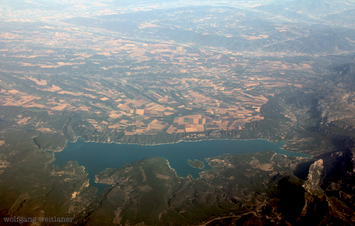 Wie schon mehrfach gesagt, ist ein Fensterplatz im Flugzeug sehr oft sehr spannend. Und so auch auf diesem Flug von Wien nach Barcelona. Dieser See hat mir außerordentlich gut gefallen – und ich habe ihn daher fotografiert und dann zu Hause – anhand von Landkarten – versucht, herauszufinden, wie er heißt. Es handelt sich um den Lac de Sainte-Croix an der Grenze der beiden Departements Alpes-de-Haute-Provence und Var im Naturpark Verdon. Dieser Stausee, der inden 1970er-Jahren errichtet wurde, ist Frankreichs zweitgrößter.