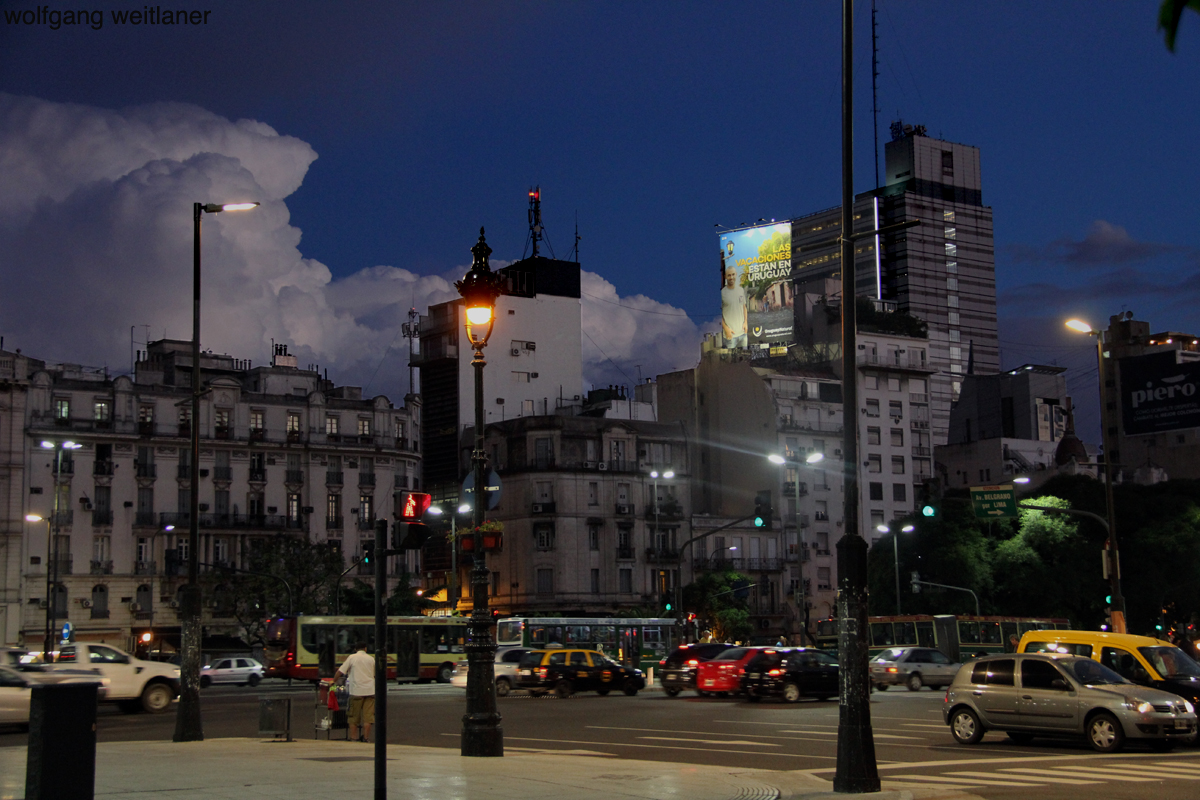 Ein Sommertag in Buenos Aires geht langsam zu Ende. Es ist knapp von Weihnachten – bis das Christkind kommt sind es noch 10 Tage. Das Wetter ist sommerlich warm – bei 25 Grad Celsius. Am Horizont sieht man Gewitterwolken aufziehen und helle Blitze zucken durch die Nacht. Dann kommt ein kurzer unergiebiger Regen, der nach wenigen Minuten wieder aufhört. Die Stadt dampft weiter, denn die aufgeheizten Fassaden der Häuser und der dunkle Asphalt geben die Hitze des Tages nur langsam ab.