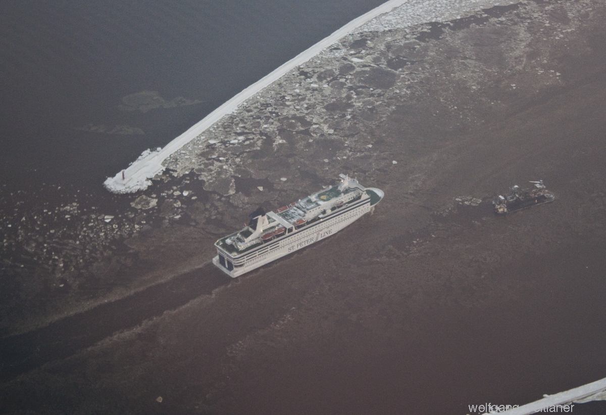 Manchmal gelingen einem Bilder, die man selbst nicht für möglich hält. Die Szenerie war wie folgt. An einem sehr fühen Jänner-Morgen saß ich im Flugzeug von Tallinn nach Riga. Knapp nach dem Sonnenaufgang setzten wir schon wieder zur Landung an. es war klirrend kalt und kurz vor dem Aufsetzen tauchte diese Fähre, die gerade nach Riga unterwegs war, auf.