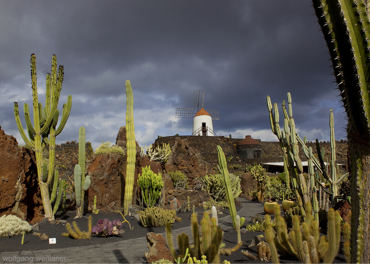 Ja, meine lieben Leserinnen und Leser – noch ein Bild von Lanzarote. Ich gebe es zu, dass ich es für den Wochenbeitrag „Regen“ aufgehoben habe. Die Stimmung war extrem bedrohlich und der Himmel verfärbte sich tiefschwarz. Das tatsächlich ‚Ergebnis‘ des Niederschlags fiel allerdings sehr mager aus: es regnete keine fünf Minuten und das auch nur sehr spärlich. Dann verschwanden die Wolken wieder und es war schön. Wie schon in meinem Lanzarote-Artikel beschreiben, ist diese Kanaren-Insel ein Schmuckstück. Und das nicht nur wegen der außergewöhnlichen Landschaft, sondern auch wegen der von Cesar Manrique geschaffenen Bauwerke und Anlagen. Manrique wird fälschlicherweise oft als Architekt bezeichnet, obwohl er das nicht war – vielmehr gab er Architekten Hinweise, wie man naturverbunden bauen kann. Der Kaktusgarten war übrigens sein letztes Werk, aber das wissen meine Leser/Innen ja ohnehin.